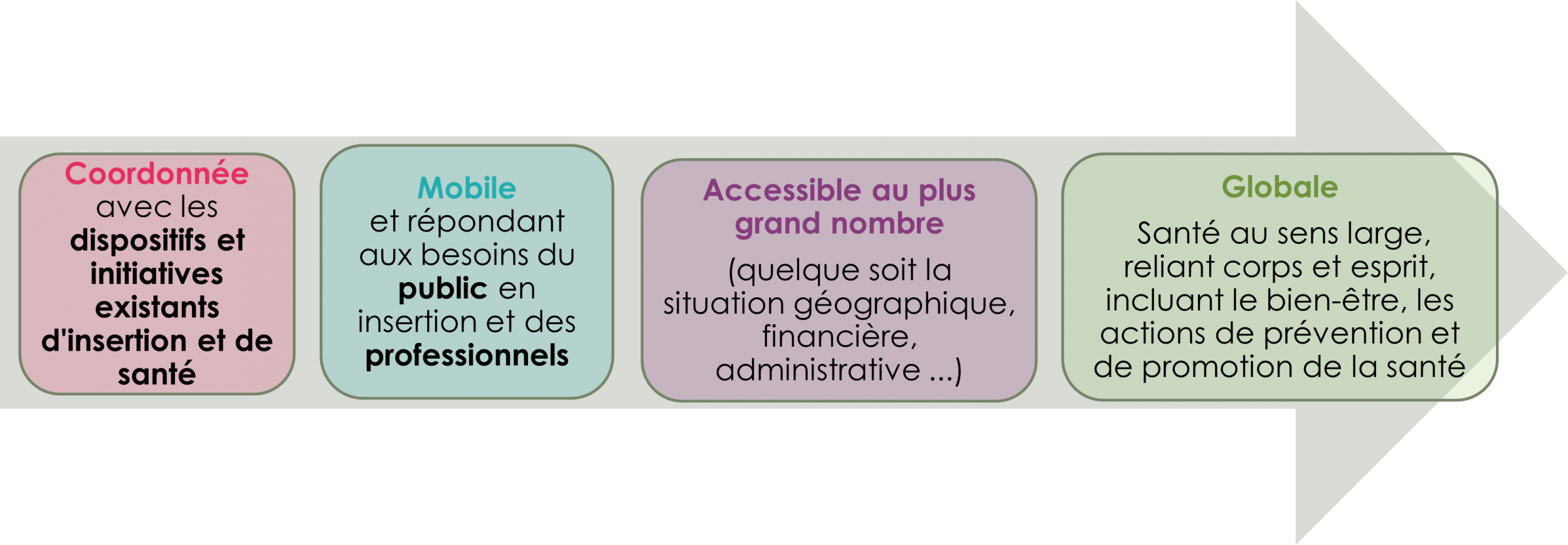 Les objectifs de la plateforme santéL'objectif général est l'amélioration de la prise en compte de la problématique santé dans les parcours d'insertion, ainsi 3 objectifs opérationnels ont été définis :